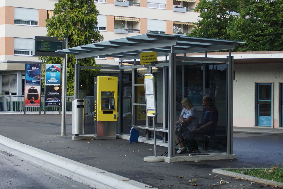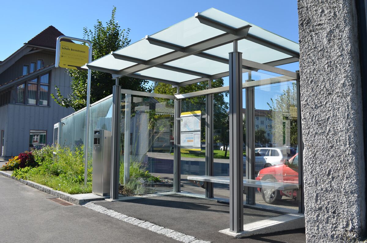 Unterstände im eigenentwicklten System PESO© werden im öffentlichen Bereich eingesetzt, um den wartenden Busfahrgästen Zuflucht und Schutz vor Wind und Wetter zu bieten.