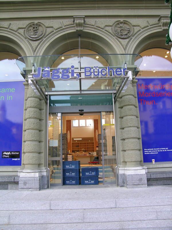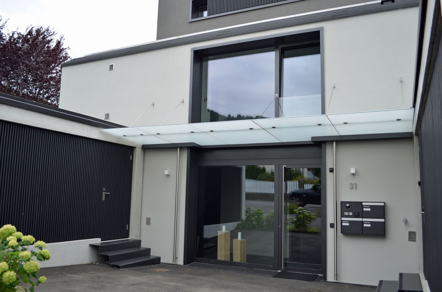 - Glasvordächer mit Glastragprofilen in T-Stahl mit Zugstangensystem an Fassade befestigt