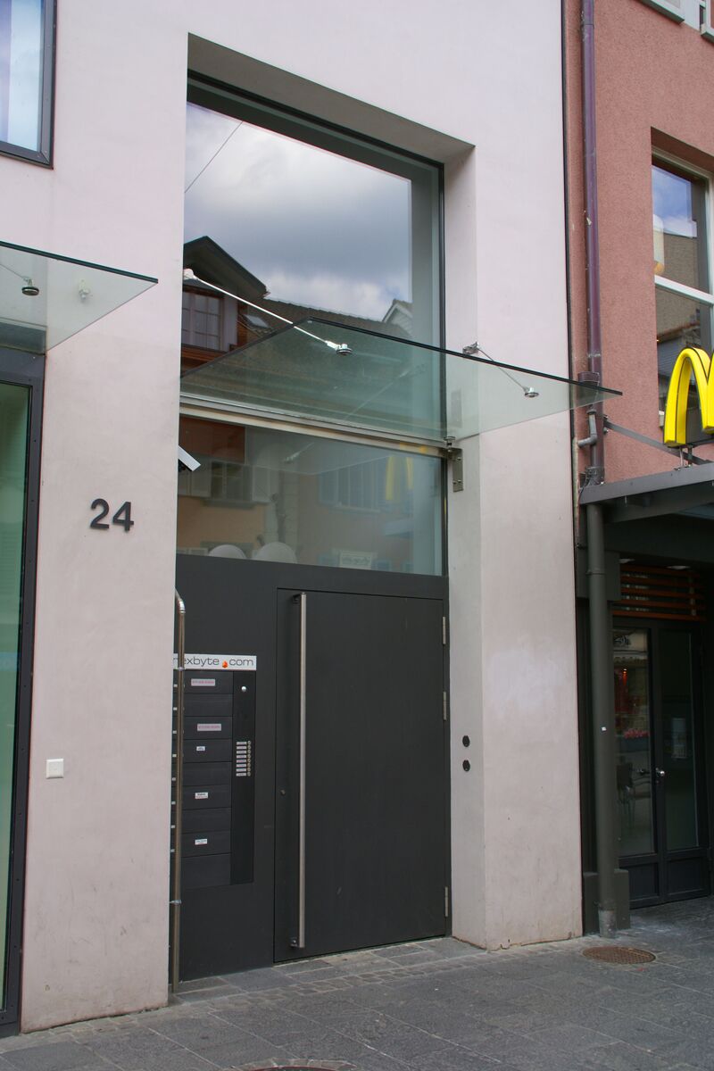 - Glasvordächer in Ganzglas Ausführungmit Zugstangensystem an Fassade befestigt
