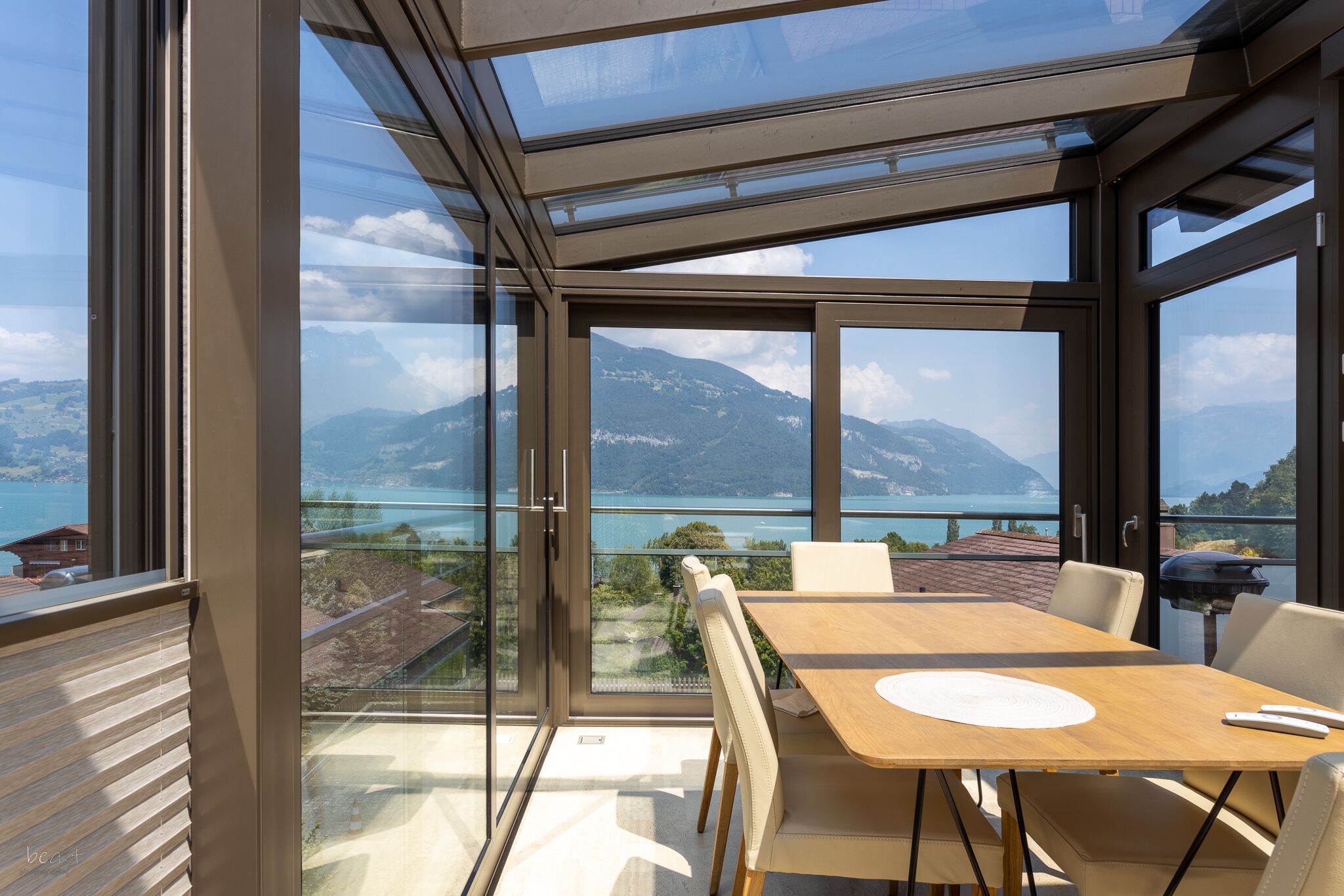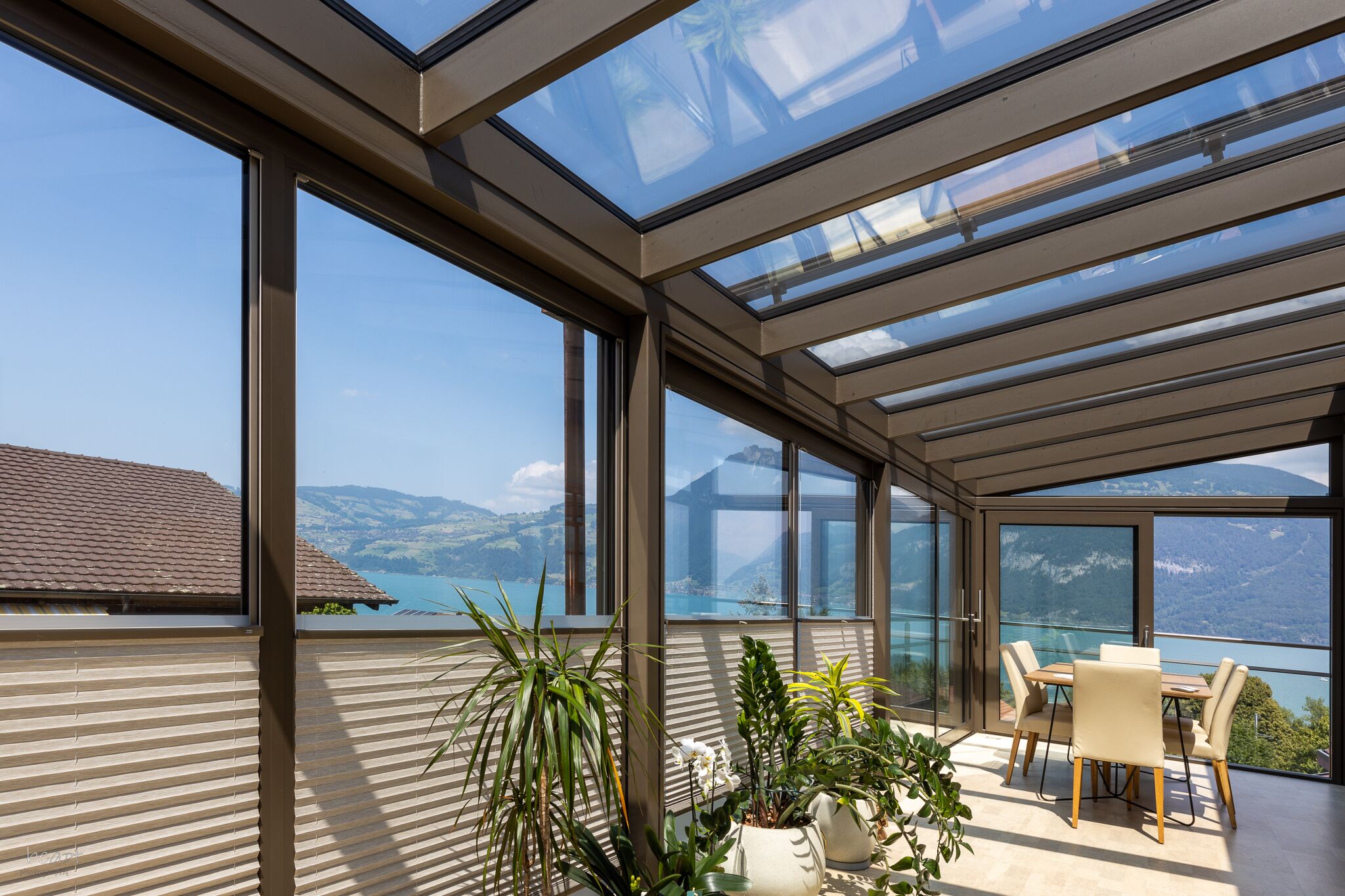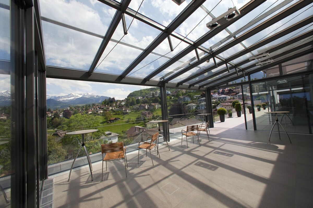 - Eingesetzt werden Dachbeschattungen und Vertikalbeschattungen der Schweizer Marke Stobag